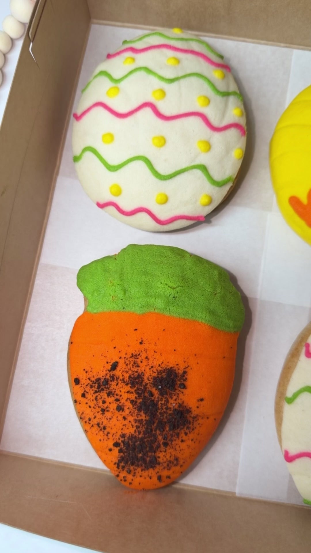 A festive Easter treat featuring 6 soft conchas decorated as cute chicks, carrots, and Easter eggs.